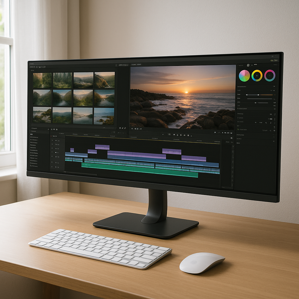 Écran ultra large 34” WQHD, HDR10, haut-parleurs intégrés.